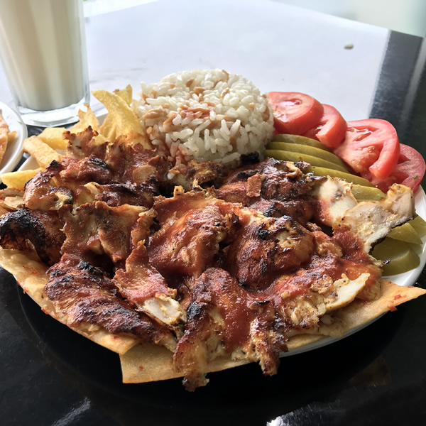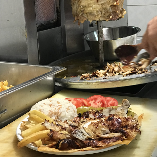 Özel baharatlarla hazırlanmış sos ile marine edilerek üretilen tavuk döneri, taze patates, salatalık turşusu, mayonez ve özel baharatlarla zenginleştirilen salça sosu ve pirinç pilavı ile sizlere sunulmaktadır.